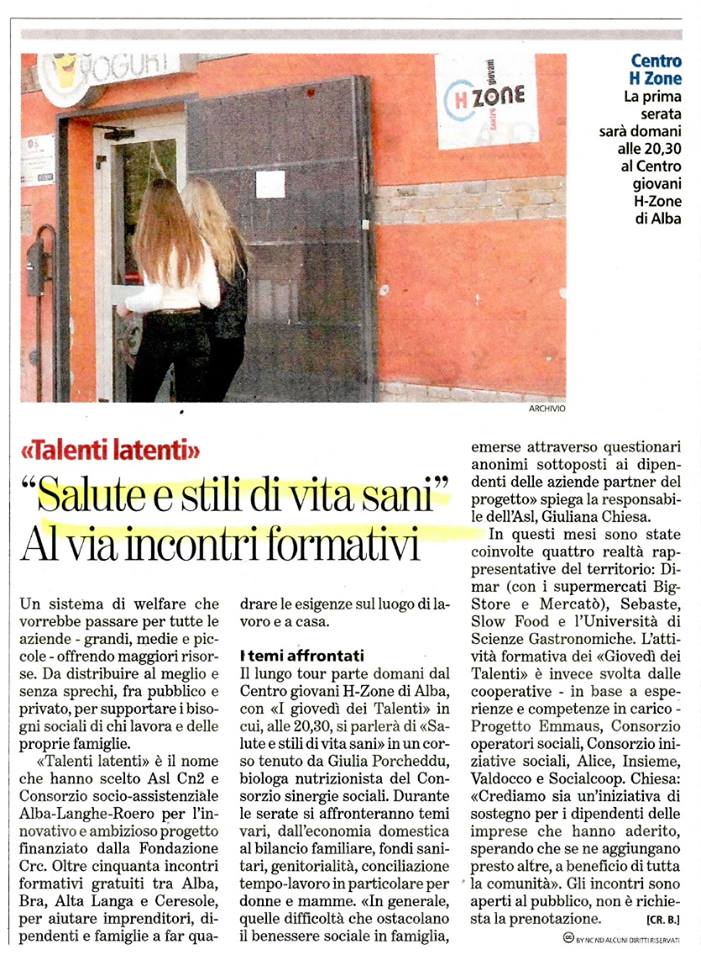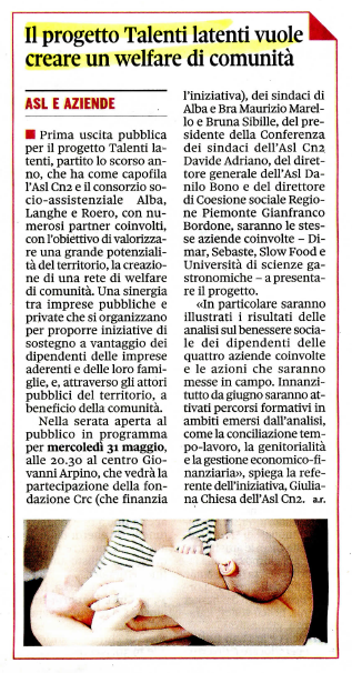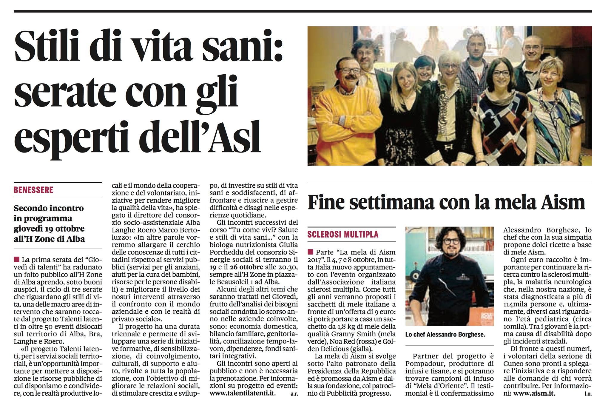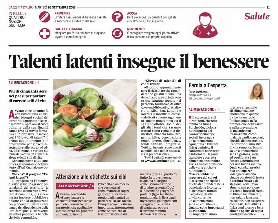ilNazionale – Giovedì di Talenti: il 12 ottobre a Bra aperitivo con l’autore sulla genitorialità 2.0 Langheroeromonferrato.net – Bra, aperitivo al “Giovedì dei talenti”. Incontro con lo psicologo Lancini Gazzetta d’Alba: Stili di vita sani: serate con gli esperti dell’Asl La Stampa: “Salute e stili di vita sani”. Al via incontri formativi Gazzetta d’Alba – Talenti latenti insegue il benessere Gazzetta d’Alba: Talenti Latenti insegue il benessere Secondo Welfare – Welfare di comunità in provincia di Cuneo: al via gli incontri formativi di Talenti Latenti TargatoCn – Al via i “Giovedì di Talenti” nei territori di Langa e Roero Il progetto Talenti Latenti vuole creare un welfare di comunità Talenti Latenti: rete per un welfare di comunità Navigazione articoli Questo sito o gli strumenti terzi da questo utilizzati si avvalgono di cookie necessari al funzionamento ed utili alle finalità illustrate nella cookie policy. Cliccando su Accetto acconsenti all'utilizzo dei cookie da parte nostra. Accetto Consulta la Cookie Policy